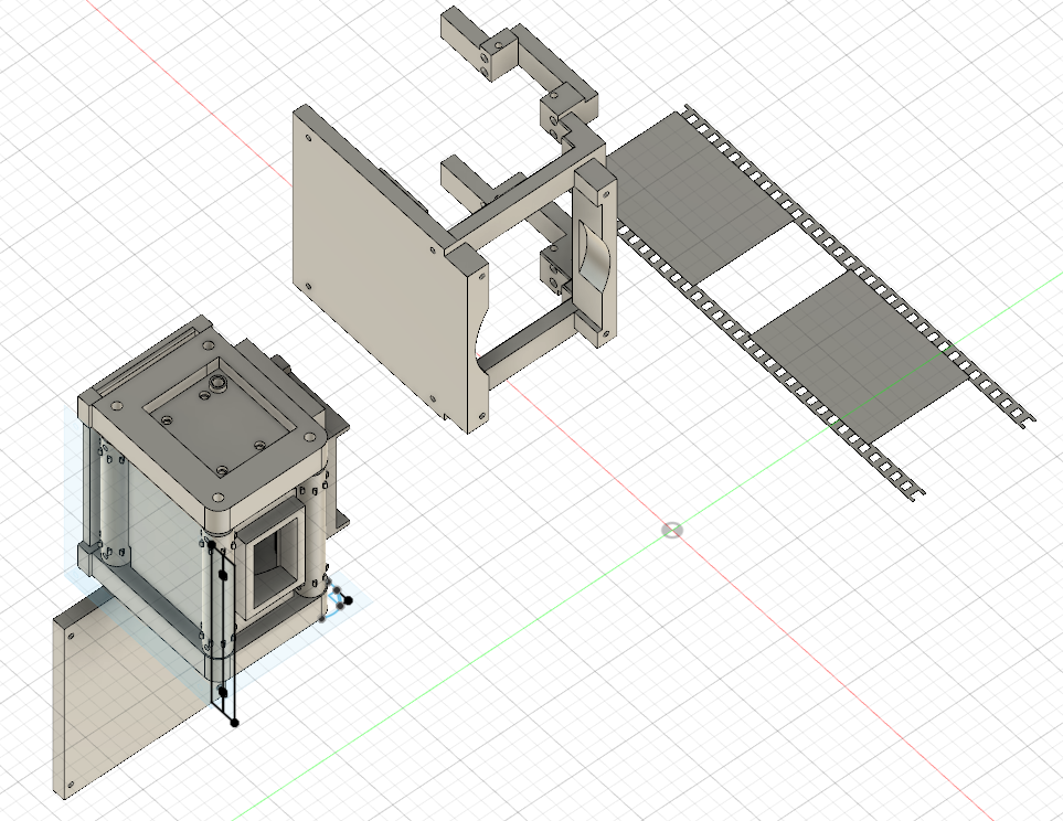 ソフトの関係で横からの画角になってしまって申し訳ないですが、少し説明すると一番左下と真ん中あたりにあるゴツゴツしたものがシャッターの機構をカメラボディに固定するための骨組、一番右上にあるものが露光するとき以外にフィルムに当たる光を遮るシャッター幕、ここまでの説明のどれにも該当しない一番複雑そうな形をしているのが、実際にモーターを取り付けてシャッター幕を動かすためのシャッターの機構になります。やってることはたいして難しくないのに調子に乗ってフィルムが現役だった時代のカメラの構造を全部無視して新しく考えたせいで設計だけで1週間ぐらいかかりました。大人しく構造だけでも模倣しとけばよかったかもしれません。